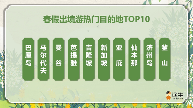 出境游方面,6天的长假同步激发了春假游客出境游的热情,除中国香港、中国澳门外,东南亚方向的海岛度假、城市休闲等旅游产品成为春假游客预订的热门。其中,巴厘岛、马尔代夫、曼谷、芭提雅、吉隆坡、新加坡、亚庇、仙本那、济州岛、釜山等目的地是截至目前途牛用户更为热门的选择。