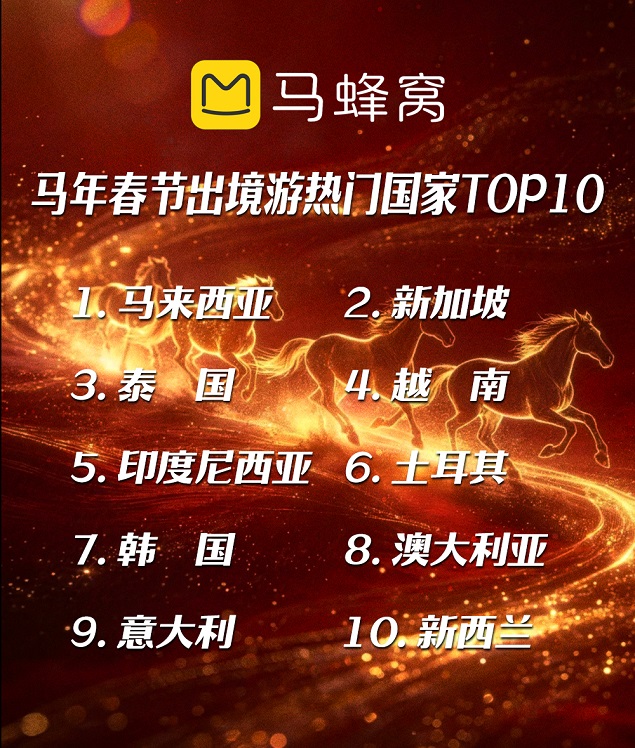 国内市场火爆的同时,出境游迎来格局大重构,马蜂窝大数据显示,2026年春节出境游服务预订量同比增长近30%,但目的地榜单发生显著变化,马来西亚跃升为出境游热门目的地榜首,新加坡、泰国、越南、印度尼西亚、土耳其、韩国、澳大利亚、意大利、新西兰包揽前十。其中土耳其凭借免签政策红利,热度暴涨235%;米兰冬奥会与春节假期重合,带动意大利旅游热度飙升,热度增长310%,米兰、罗马成为出境游热门城市,“观赛+旅行”成为全新出行潮流。