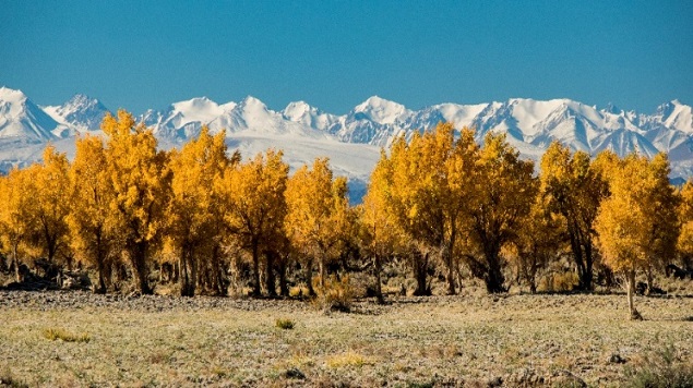 雪山与胡杨相映成趣