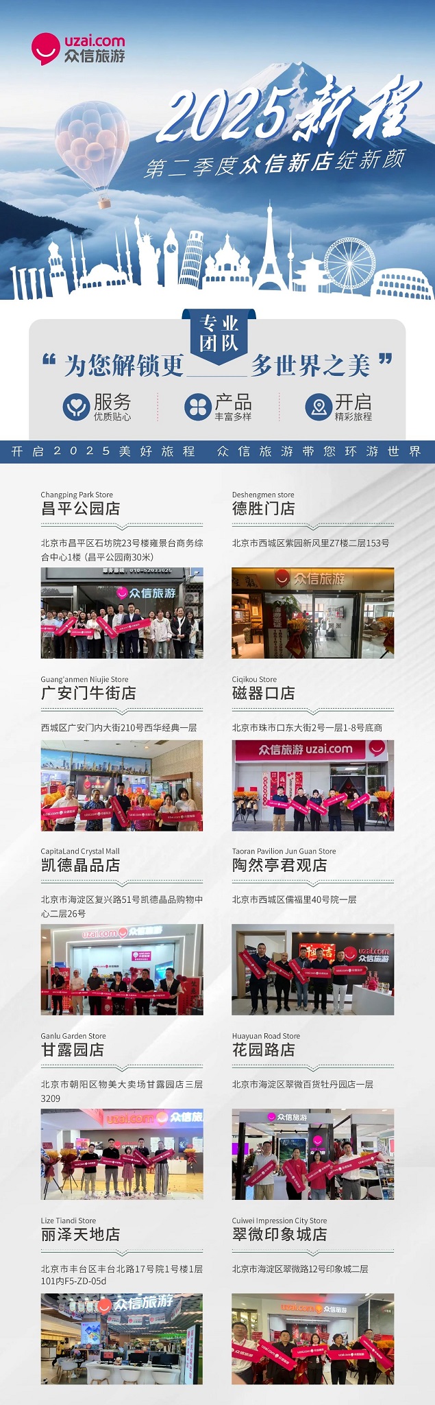 随着众信旅游北京十家门店开业,众信旅游在北京范围内门店数量达150家,已基本形成北京“1小时交通圈”服务网络,众信旅游全国门店数量达2500家。截至2025年年底,众信旅游计划将在京津冀范围再添33家门店。与此同时,众信旅游还将携手更多跨品牌合作伙伴,持续将更多“旅游服务+本地生活”运营圈接入门店服务网络,持续为旅游零售门店合作生态赋能,亦为众信旅游游客门店体验升级服务持续助力。