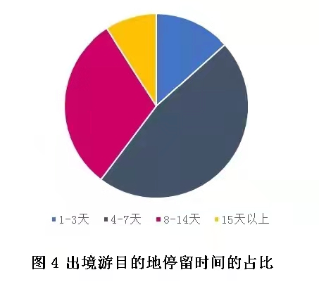 大部分受访者对未来出境旅游的时间预期在一周以内。计划停留1-7天的受访者所占比例为六成以上,其中4-7天的接近五成。计划停留15天以上的受访者所占比例为不足10%。