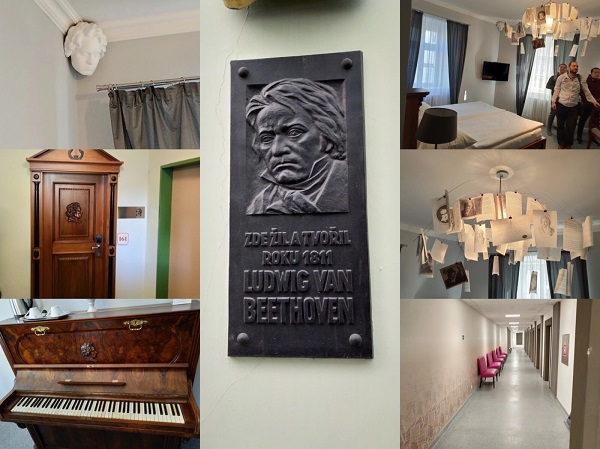 这一段行程最让大家激动的就是酒店的负责人带领小编一行亲自到贝多芬当年居住过的房间参观,这间房在二楼角落,房门就和其他房间有很大的区别,里面有一架早已无法使用的钢琴,酒店把它改造成了放置房间物品的地方。此外,这间屋里最引人关注的便是在屋顶墙角处的贝多芬头像(说实话,晚上可能会有点吓人)。这间房间规格很高,平时都是VIP才能有幸见到或者入住,所以今天小编也体验了一把“贵宾”的感觉。