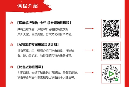刚刚上线的【深度解析秘鲁“秘”境专题培训课程】共有5个不同的模块组成,大家也可以通过秘鲁旅游局的官方微信,进行在线学习。这个课程向同业者们展示了秘鲁鲜活的历史和文化、纯净美好的自然风光、美食之都、购物圣地、刺激历险、奢华体验等多维度挖掘更多的行程亮点。完成所有章节学习,并通过在线考试后,您将获得“秘鲁旅行专家(中级)证书”。