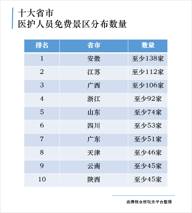 携程还公布了对医护人员免费景区最多的十大省份,前十名分别是安徽、江苏、广西、浙江、山东、四川、广东、天津、云南和陕西。前三名的省份,提供医护人员优待政策的景区,均超过一百家,安徽以138家优待景区排名第一,江苏、广西以112家、106家紧随其后。