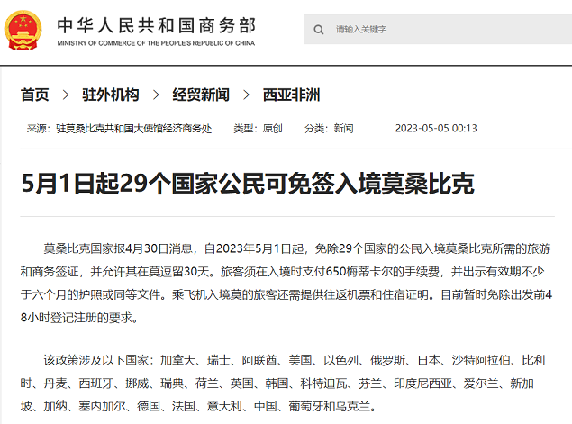 据莫桑比克国家报消息:自2023年5月1日起,免除中国、加拿大、美国等29个国家的旅游和商务签证。