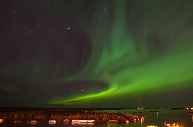冬意渐浓,耶洛奈夫/黄刀镇 (Yellowknife)附近的湖面上已经开始结冰,目下所及皆为地平线上下的旖旎风光,我们的眼睫毛和发丝都被冷空气包裹,逐渐凝结成霜。夜幕降临,首先是较为微弱的带着一些白色光影的绿色光幕出现,慢慢的,光幕延伸到我们的头顶,越来越明亮夺目,也出现更多的色彩和形状,在我们头顶舞动的,正是来自大自然的赞歌-北极光。