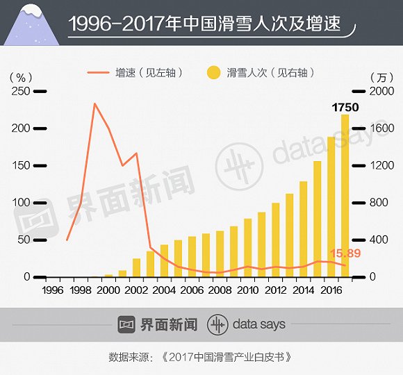 20年前,中国滑雪人次仅有1.5万,2017年已达1750万人次,并保持15.89%的高速增长。