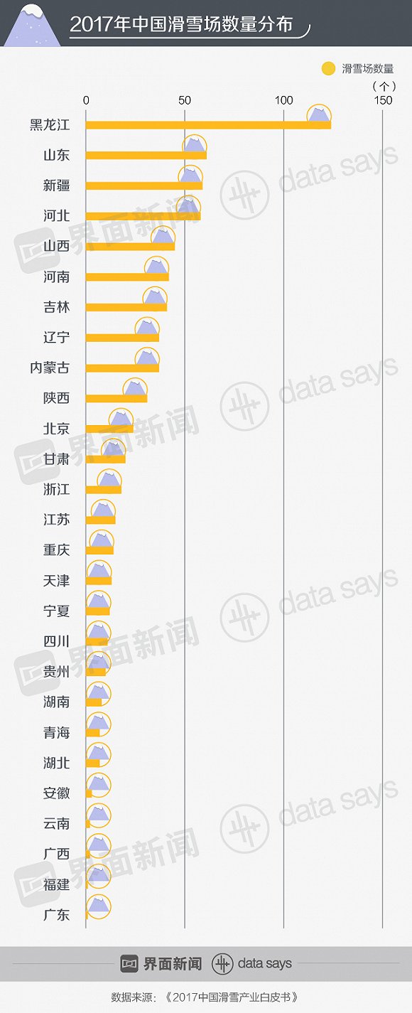 在700多个滑雪场中,黑龙江的滑雪场数量最多,有124个,其次是山东和新疆。