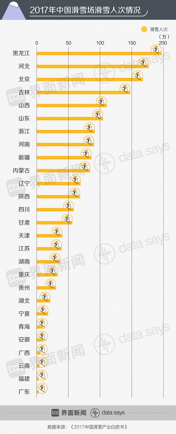 2016-2017年雪季,黑龙江共接待滑雪人次达196万。相较于有124个滑雪场的黑龙江,北京仅有24个滑雪场,却接待了167万人次。