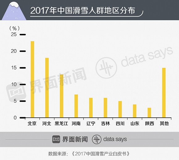 从滑雪人群的来源地区看,北京是全国最爱滑雪的地区,占总滑雪人群的23%,河北和黑龙江分列二三。相较于北方得天独厚的地理优势,南方滑雪的人数并没有北方那么高。