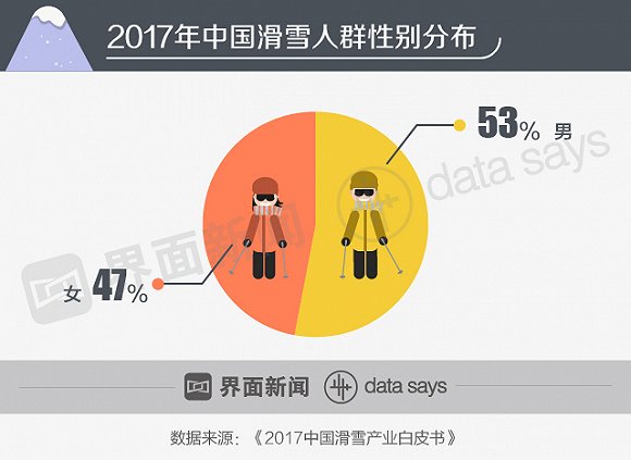 从性别看,滑雪人群中男性占比为53%,略高于女性。