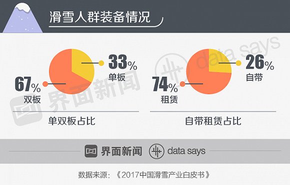 从装备看,使用双板的滑雪人群是单板的两倍,只有26%的滑雪人群自带装备。