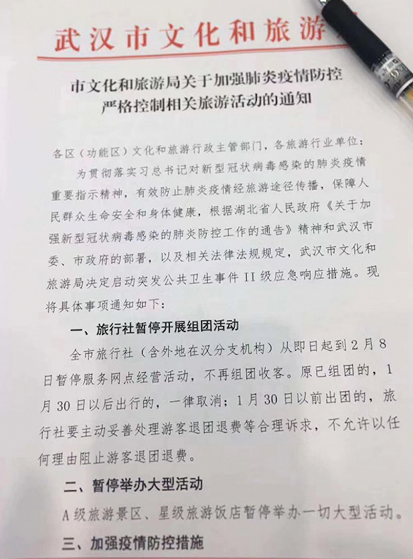 《通知》要求:一、旅行社暂停开展组团活动。全市旅行社(含外地在汉分支机构)从即日起到2月8日暂停服务网点经营活动,不再组团收客。原已组团的,1月30日以后出行的,一律取消;1月30日以前出团的,旅行社要主动妥善处理游客退团退费等合理诉求,不允许以任何理由阻止游客退团退费。 二、暂停举办大型活动。A级旅游景区、星级旅游饭店暂停举办一切大型活动。三、加强疫情防控措施。