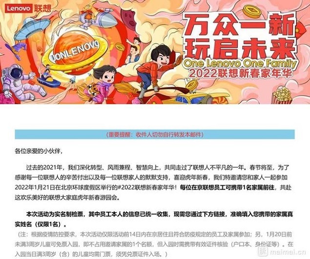 据网传图片显示,联想集团邀请所有在京居住的员工参加本次活动,并且每位员工可携带一名家属参加。