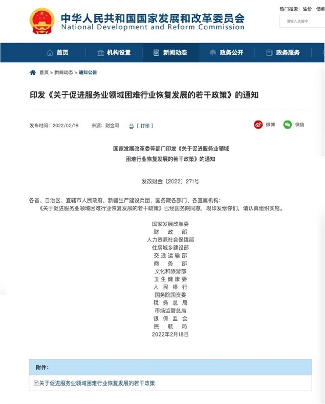 国务院总理李克强2月14日主持召开国务院常务会议,会议指出,当前服务业因受疫情等影响存在一些特殊困难行业,要抓紧出台措施,针对餐饮、零售、旅游、交通客运等特殊困难行业,加大帮扶力度,促进稳就业和消费恢复。2月18日,国家发改委、财政部、文化和旅游部等14部委联合印发《关于促进服务业领域困难行业恢复发展的若干政策》,正式推出多项具体针对旅游业等服务产业的纾困扶持措施,包括加强普惠金融力度和贷款服务、旅行社保证金、政府采购等多方面内容。