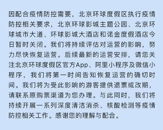 北京环球度假区10月26日在微博发布通知,因配合疫情防控需要,北京环球度假区执行疫情防控相关要求,北京环球影城主题公园、北京环球城市大道、环球影城大酒店和诺金度假酒店今日暂时关闭。