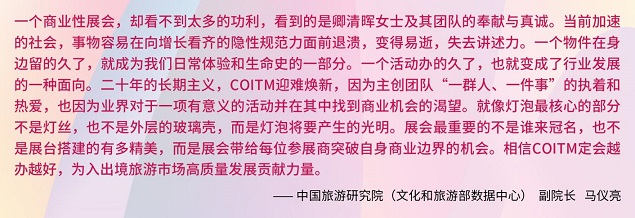 COITM自筹备以来,已收到海内外众多旅游目的地政府机构与无数中国旅游业者的鼎力支持、参与和祝福!中国旅游研究院(文化和旅游部数据中心)马副院长在给COITM的寄语中期待“展会带给每位参展商突破自身商业边界的机会“。