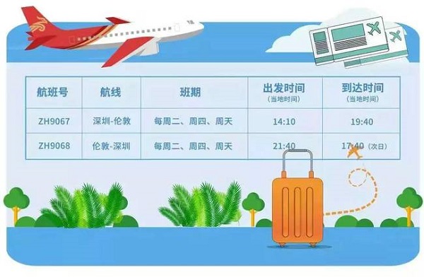 据悉,该航线由深圳航空A330-300型客机执飞,每周二、周四和周日从深圳机场(7.670, 0.06, 0.79%)起飞。北京时间当日14时10分,航班从深圳起飞,并于当地时间19时40分抵达伦敦希斯罗机场;当地时间21时40分从伦敦起飞,北京时间次日17时40分抵达深圳。