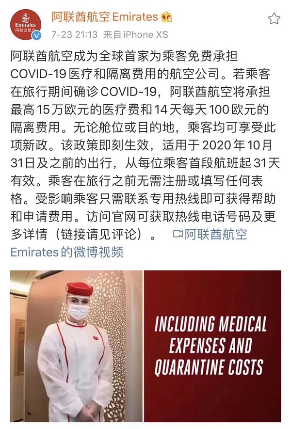 当地时间23日,阿联酋航空宣布将为乘坐阿航飞机往返阿联酋和世界各地的乘客,支付与新冠相关的医疗费用和检测费用。阿联酋航空也通过其官方微博发布了声明。