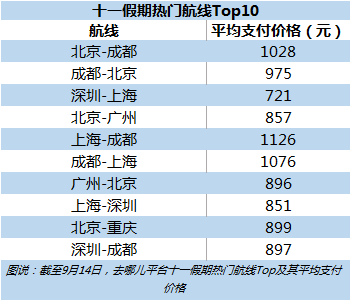 结合去哪儿网国庆机票预订数据来看,多条热门航线平均支付价格低于去年,北京出发旅客多前往成都、深圳、广州和上海,其中北京-成都的平均支付价格为1028元,同比下降14%;北京-广州的平均支付价格为857元,同比下降26%。