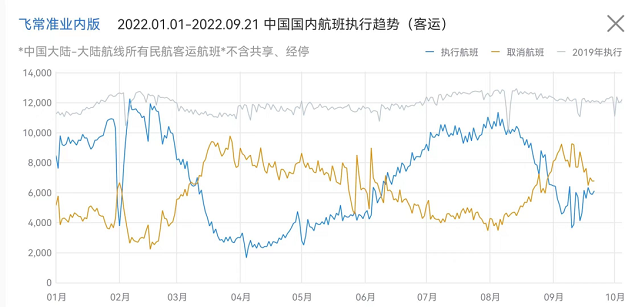 从飞常准业内版数据看,自8月底以来,国内客运航班的每日取消量超过了执行量,整体取消了高于50%。不过可以看到,9月中旬以来,航班执行率在波动回升。