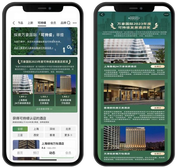 同时,首个可持续专题页也展示了获得集团2023年"可持续发展杰出贡献奖"的三家酒店,上海鲁能JW万豪侯爵酒店参与减少食物浪费计划,采用本地食材采购,香港数码港艾美酒店客房内已安装了直饮水净水器,天津陆家嘴万怡酒店实施LED照明,各家酒店在日常运营中已全面践行可持续发展举措。