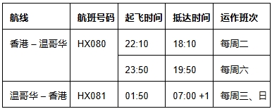 香港航空来往香港和温哥华的航班详情*如下(所有时间均为当地时间):