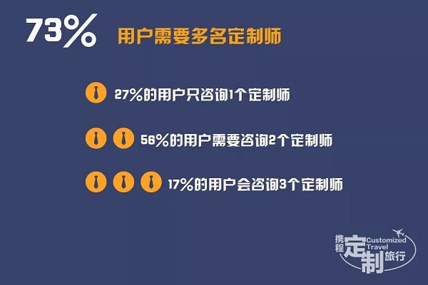 根据携程定制旅行平台数据显示,56%的用户需要咨询2个定制师,17%的用户会咨询3个定制师。27%的用户只咨询1个定制师。