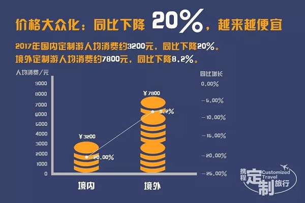 根据携程定制旅游平台数据显示,从全国范围来看,2017年国内定制游人均消费约3200元,同比下降20%,境外定制游人均消费约7800元,同比下降8.2%。
