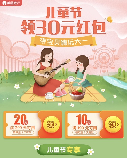 除了力度空前的折扣外,美团旅行将同时派发30万份限时红包,面值10元、20元不等,总价值高达400万元,领取后3天内有效。折扣门票加立减红包,双重优惠带给大家更好的六一游玩体验。