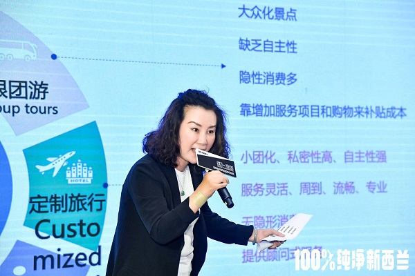 姚昉分享完毕后,请出了新西兰最大的毛利景点集团公司Ngai Tahu Tourism 大中华区销售总监曹珣进行分享。曹珣流利、轻松的分享过程,让在场业者时不时爆发出鼓掌声。曹珣还分享了5个产品大片,让在场业者享受了一场场视觉盛宴。曹珣从新西兰资源方的角度,分享他们公司如何配合定制社需求,进行资源输出。曹珣主要分享了爱歌顿皇家牧场、夏特欧瓦喷射快艇、探索格林诺奇三部曲之旅、达特河独木舟探索之旅以及冰川南湖直升飞机观光产品这些非常适合做定制游产品的资源,还分享了承接安利团的案例,希望借此给予在场业者资源和启迪。