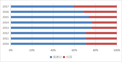 图2 2010-2017年我国出国旅游人次与赴港澳台旅游人次比较
