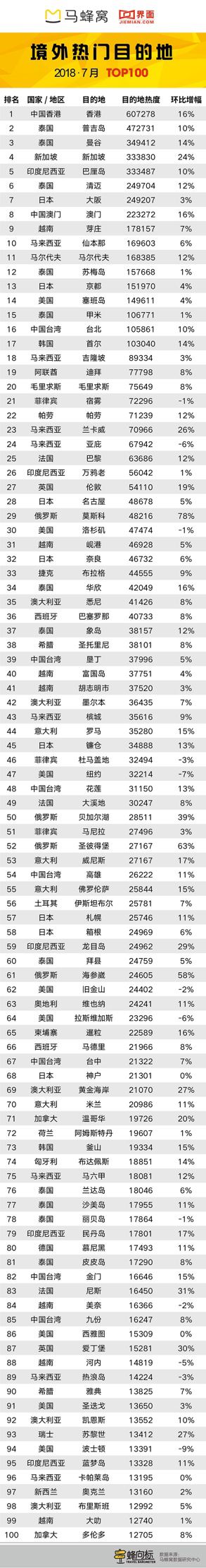 近日,马蜂窝旅游网联合界面推出2018年7月“旅游蜂向标”,暑期主题成为中国旅行者全球旅游的主旋律。该榜单基于马蜂窝旅游大数据平台,通过分析境内外旅游目的地的热度变化,对7月的全球旅游趋势进行了预测。