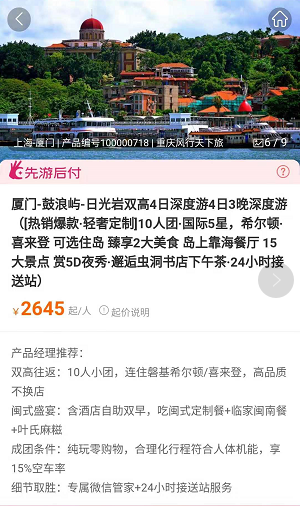 据了解,近期驴妈妈在全国率先推行了“先游后付”新消费模式,游客可以享受先出游,归来后满意再付款。以平台人气较高的厦门鼓浪屿避寒跟团游产品为例,旅途中的接机、住宿、餐饮、线路等方面进行了规定,如果出行中发生行业违规,或未达到约定服务标准,驴妈妈根据相应的赔付条款,向游客进行赔付。