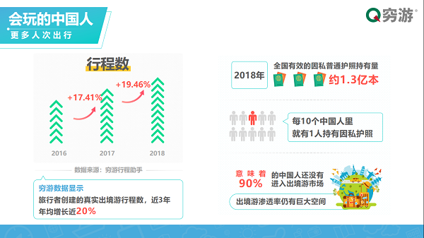 报告显示:截止到2018年,全国有效的因私普通护照持有量达到了1.3亿本。换言之,90%的中国人还未进入出境游市场,整体出境游渗透率仍拥有巨大空间。
