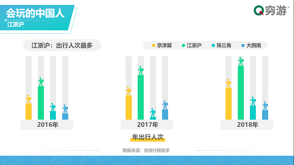此外,京津冀地区的旅行者也更偏爱自驾游,2018年京津冀自驾游比例达到了15.65%,远超于其他地区。而江浙沪地区从出行总人次上,江浙沪的旅行者遥遥领先。