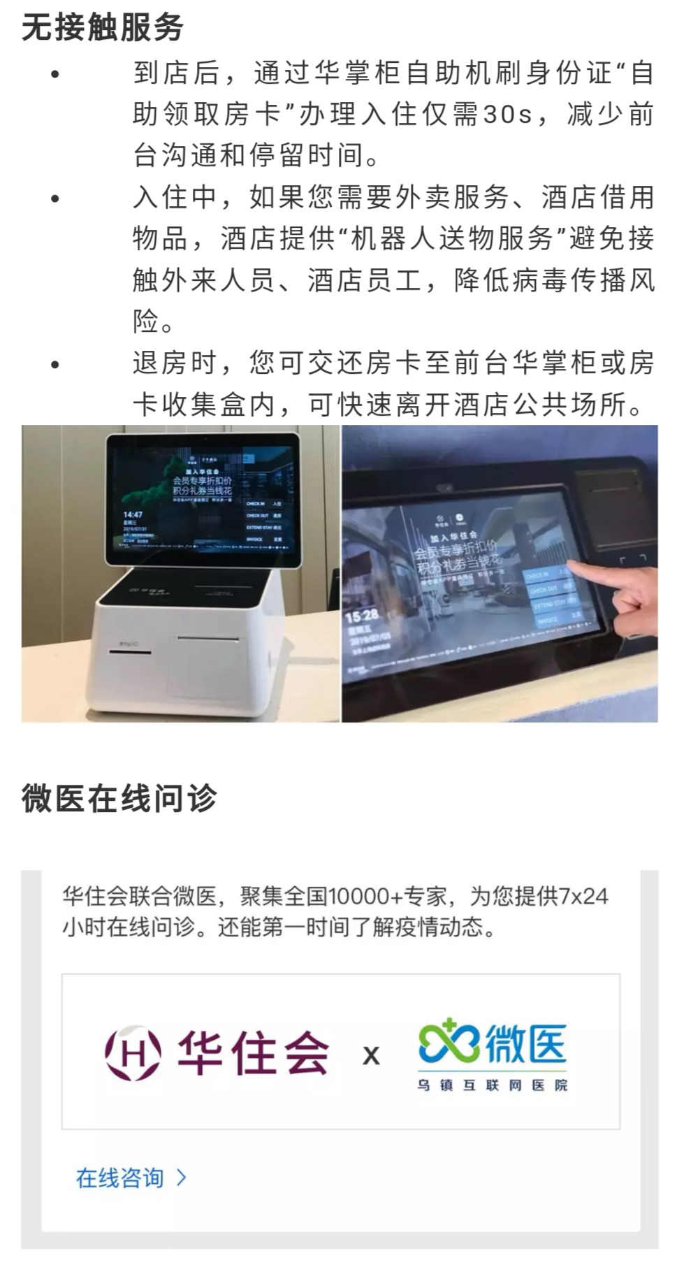 针对当前的疫情,各大合作酒店集团推出了众多服务政策。例如,华住推出了无接触服务,客人到店后,可通过华掌柜自助机刷身份证“自助领取房卡”,办理入住仅需30秒,减少了和前台沟通和停留时间。入住中,如需外卖服务、酒店借用物品等,酒店的“机器人送物服务”也将极大地降低病毒传播风险。同时,华住还联合微医为入住客人提供7 x24小时在线问诊。
