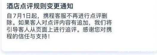 最新消息,自7月1日起,携程客服不再进行点评删除。如果客人对点评内容有追加,携程客服将引导客人从页面上进行评论追加。