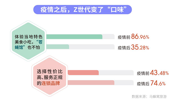 疫情之前,86.96%的Z世代喜欢在旅行地打卡当地特色“苍蝇馆”。但疫情之后,他们变了“口味”,出于安全卫生因素的考虑,这一人群比例大幅下降到35.28%。而选择服务正规的连锁餐饮品牌的年轻人从疫情前的43.48%升至74.6%。
