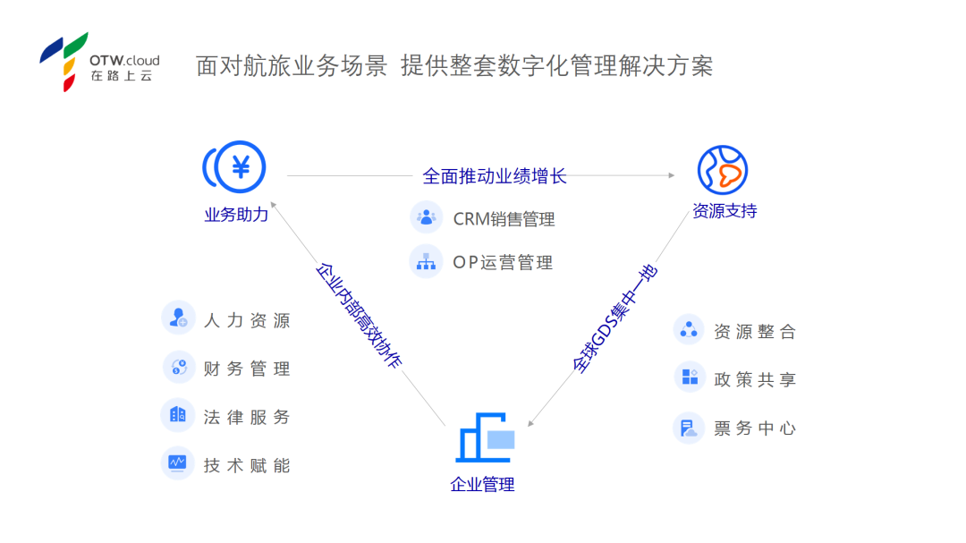 OTWCloud ERP+上线初期,将秉持“技术驱动、开放创新”的理念,为客户提供全资源、全产品、全流程、全管理的航旅数字化管理解决方案,帮助传统的机票代理人、旅行社、TMC在新的形势下拓展业务、快速转型。