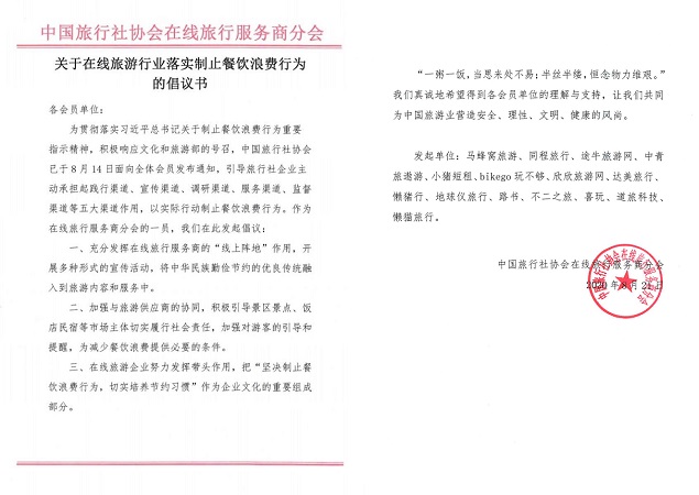 “一粥一饭,当思来处不易;半丝半缕,恒念物力维艰。” 近日,中国旅行社协会在线旅行服务商分会发布《关于在线旅游行业落实制止餐饮浪费行为的倡议书》(以下简称“倡议书”)。作为分会会长单位,马蜂窝旅游联合同程旅行、途牛旅游网、中青旅遨游、小猪短租、欣欣旅游网、达美旅行、懒猪行、地球仪旅行、喜玩、Bikego旅行 、不二之旅、路书、懒猫旅行等众多在线旅游企业共同发起这一倡议,号召在线旅游企业主动承担起践行渠道、宣传渠道、调研渠道、服务渠道、监督渠道五大渠道作用,宣传和培养勤俭节约的文明风尚,以实际行动制止餐饮浪费。