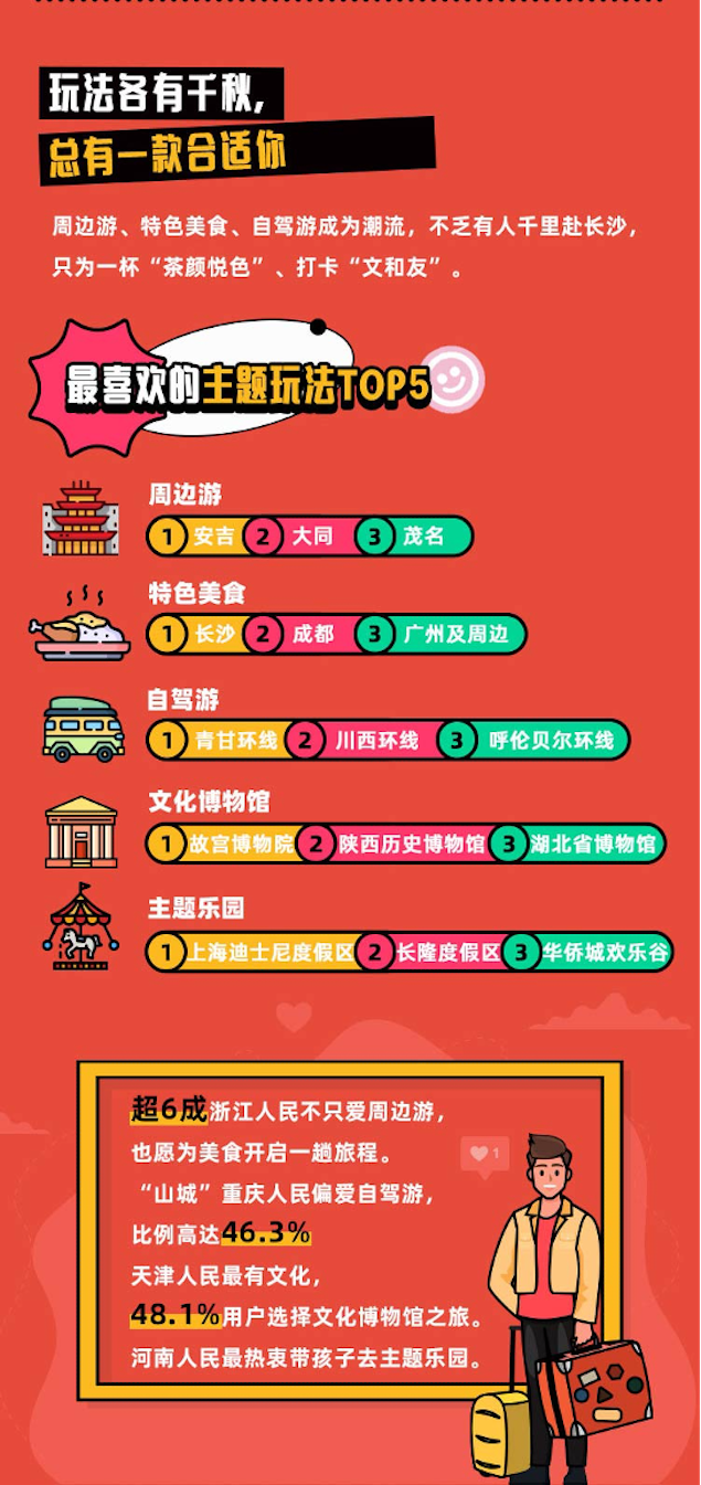 从大数据报告来看,超6成浙江人民不只爱周边游,也愿为美食开启一趟旅程。“山城”重庆人民偏爱自驾游,比例高达46.3%。天津人民最有文化,48.1%用户选择文化博物馆之旅,而河南人民最热衷带孩子去主题乐园。