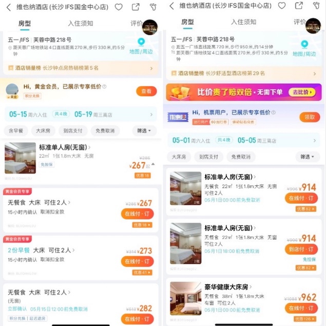 今年最网红的城市长沙,同样是错峰出游季中的热门目的地城市。与五一假期前两天相比,5月15至16日长沙酒店每晚均价便宜214元,以游客较为集中的IFS国金中心的维也纳酒店为例,五一假期单人标准间每晚元914元,而15至19日入住,每晚仅需267元。