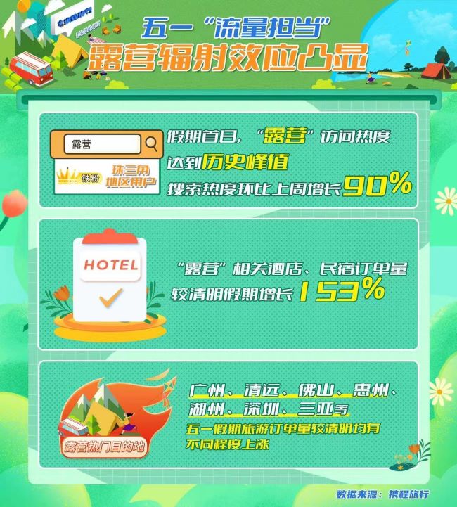 携程:五一“顶流”露营辐射效应凸显 周边酒店、民宿订单量大增