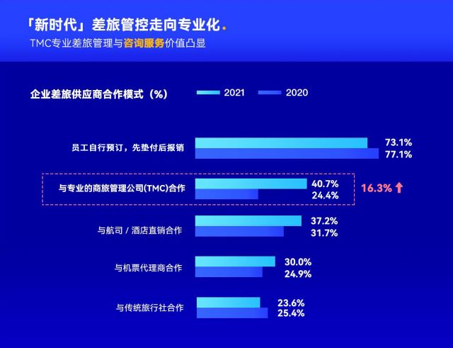 伴随十四五发展规划,企业加速数字化改革步伐。携程商旅白皮书通过对企业的广泛调研也发现,近七成的企业认为差旅管理是企业数字化转型的首要“试验田”。这主要源于差旅管理各块流程相对清晰且标准,便于企业将其作为探索数字化转型的切入点。白皮书显示,2021年与专业差旅管理公司(TMC)合作的企业同比增长16.3%。并且TMC在一线城市的增幅高达24.6%。