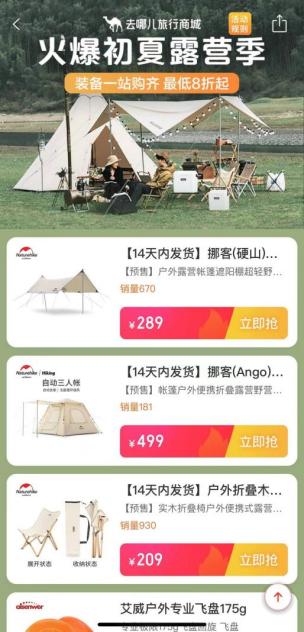 在去哪儿露营攻略板块,不难发现目前露营主流用户是30+的女性,针对主流用户打卡、遛娃的需求,去哪儿平台为其定制旅行组合与装备。除去热门景区攻略和露营地门票,去哪儿旅行商城对不同场景露营装备、露营周边进行优化组合推荐。从以往的用户挑选商品,转变为商品主动适配用户场景,用这种“以货找人”的方式为用户打造一站式露营体验。