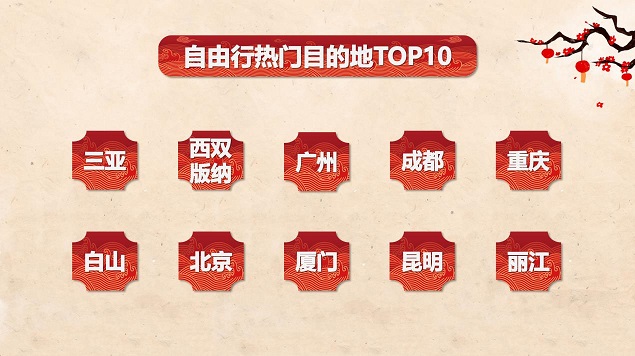 自由行方面,三亚、西双版纳、广州、成都、重庆、白山、北京、厦门、昆明、丽江等目的地依然对消费者保持着较高的吸引力,三亚的热度更是一骑绝尘。