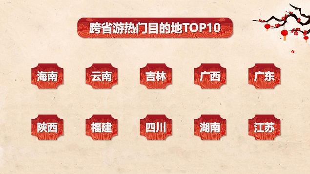 海南、云南、吉林、广西、广东、陕西、福建、四川、湖南、江苏入选“跨省游热门目的地TOP10”榜单。今年春节假期,海南、云南继续保持了热门旅游目的地领头羊的地位,两省分别吸引了近30%和18%出游用户的前往,其中,海南三亚、海口、陵水、万宁以及云南昆明、大理、丽江、西双版纳等目的地均是用户的热门选择。