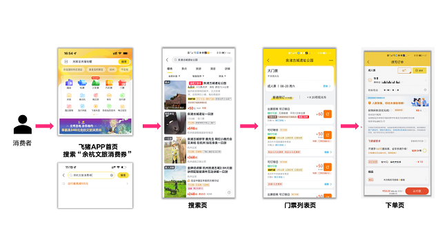 在飞猪旅行下单(无需领券,消费立减):小余准备带家人去余杭良渚度假,需购买门票产品,小余使用手机在飞猪旅行APP上搜索“余杭文旅消费券”,发现良渚古城遗址公园门票销售价格为60元,点击预订,在支付时自动匹配一张满30元减10元的券,最终实际支付价格为50元。