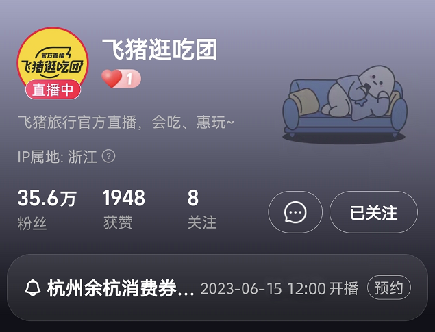 余杭亚运文旅消费券的直播间专场将设在飞猪官方直播间—飞猪逛吃团(淘宝APP搜索即可直达)。6月15日12点,将正式开启消费券的发放与使用,结合套餐内容同步宣传余杭特色,并于当天12点、18点、20点、22点多个整点不定时开放限时限量抢消费券,数量有限先到先得!